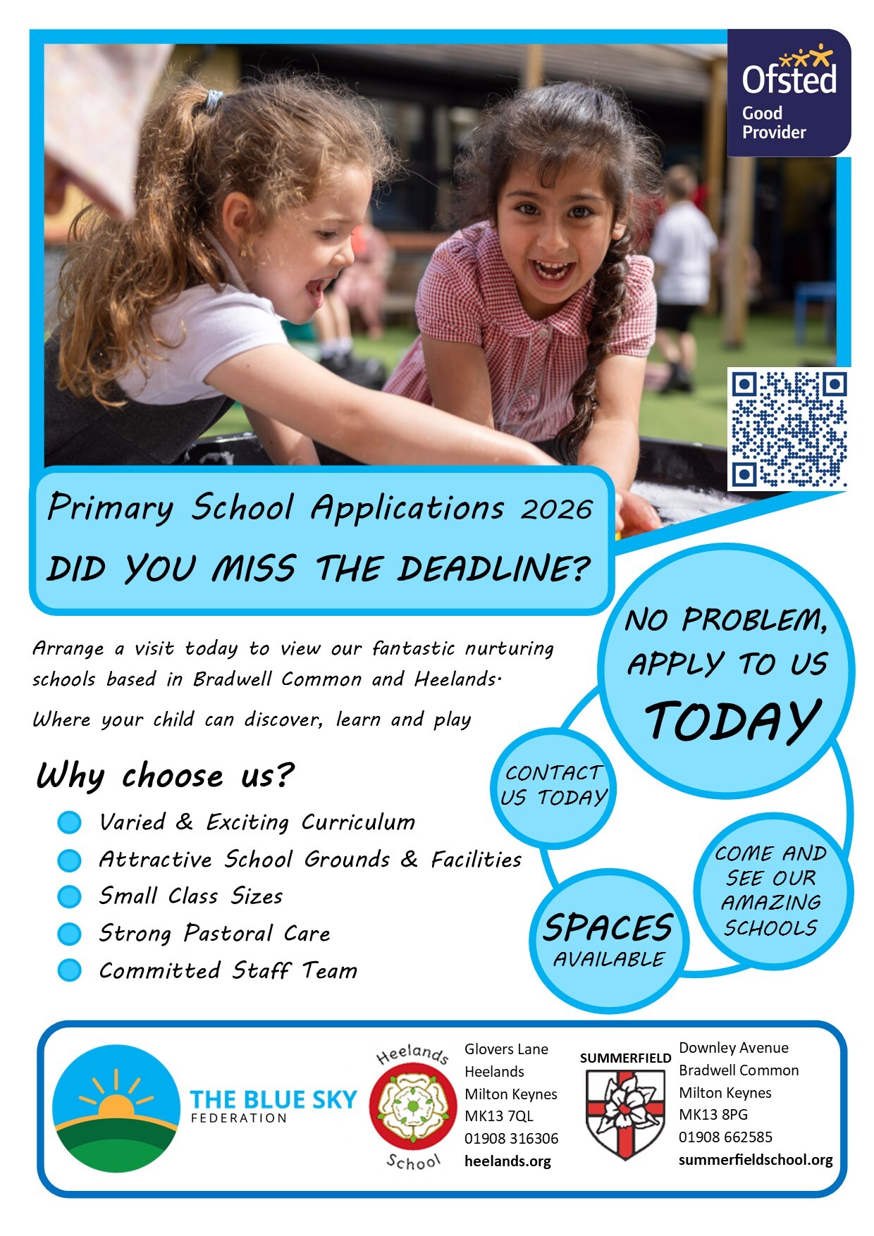 We are a one form entry Infant school situated in Heelands near the centre of Milton Keynes and we are a part of The Blue Sky Federation, alongside Summerfield School.